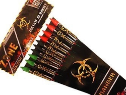 Zestaw rakiet Danger PXR210. W zestawie znajduje się 10 rakiet o wielokolorowych efektach : czerwone gwiazdy, zielone gwiazdy, białe migotanie.Kaliber : 20mm