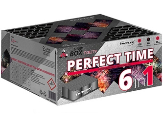 Dynamiczny zestaw z gotowym pokazem fajerwerków Perfect Time. Posiada 120 strzałów z efektami w kalibrze 25mm / 1". Czas działania wynosi ok. 70 sekund.