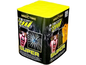 Wyrzutnia "SUPER" od Polskiego importera fajerwerków - Magic Time (dawniej firma Kometa). Posiada 16 strzałów w kalibrze 25mm. Czas działania ok. 20 sekund.
