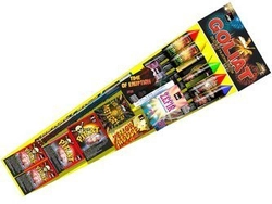 Zestaw Goliat - symbol produktu JA004. Zawiera 3 sztuki rakiet, rzymski ogień, fontanny, petardy hukowe oraz żuki.