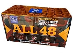 Dynamiczna wyrzutnia z serii Kasak Extreme zawierająca 48 strzałów z mixem kolorowych efektów oraz zróżnicowaną wielkością ładunków(0.8"/1"/1.2"). ALL48-01 wystrzeliwuje ładunki prosto oraz kątowo w czasie ok. 35 sekund.