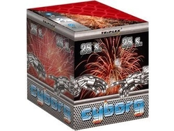 Potężna wyrzutnia Cyborg - symbol produktu TXB053. Posiada 25 strzałów o największym dostępnym kalibrze 50mm. Bogaty wachlarz kolorowych efektów. Czas działania ok. 45 sekund. [b]NAJWIĘKSZE EFEKTY NA NIEBIE! - MEGA EFEKT![/b]