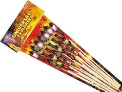 Widowiskowe rakiety z firmy Surex. Zestaw posiada efekty: 3szt czerwona i zielona dalia, 2szt trzaskająca palma, 2szt. Cytrynowa piwonia z białym stroboskopem, 3szt. Spider King, szt wierzba czerwona błyszcząca ze srebrną rybką, 2szt oraz inne.